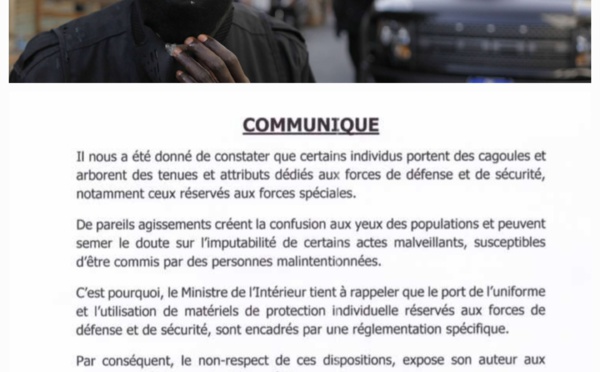 Le port des cagoules et de tenues et attributs dédiés aux forces de défense et de sécurité est devenu monnaie courante au Sénégal. Une situation qui a indisposé le ministre de l’Intérieur qui a mis en garde tous les citoyens.   Depuis un certain temps, les gardes du...