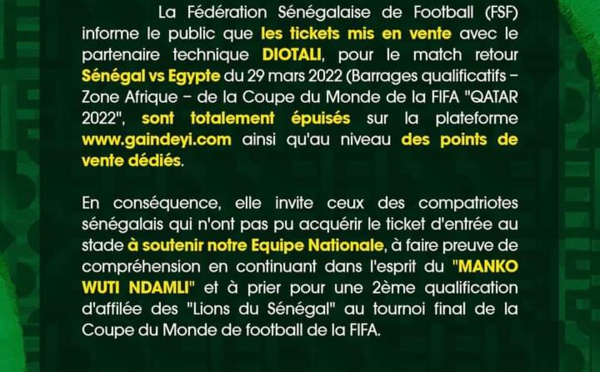 C’est à guichets fermés que va se jouer le match entre le Sénégal et l’Egypte de cet après-midi. Selon la Fédération sénégalaise de football (Fsf) dans un communiqué, les tickets ont été épuisés. «La Fédération sénégalaise de football (FSF) informe le public que les tickets mis en vente...