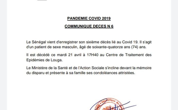 Sénégal vient d'enregistrer un sixième décès lié au Covid-19. Il s'agit d'un homme de soixante-quatorze (74) ans. Ce patient contaminé par le coronavirus a succombé, ce mardi à 17h 40, au centre de traitement de Louga où il était traité, d'après les services du ministère de la Santé. Quatre (4)...