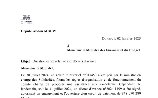 Le Député Abdou MBOW À Monsieur le Ministre des Finances et du Budget, Objet: Question écrite relative aux décrets d'avance