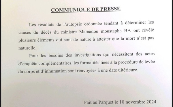 Contrairement à ce qui a été dit, le Procureur de la République a affirmé que les résultats de l'autopsie ont attesté que la mort de l'ancien ministre Moustapha Ba n'est pas naturelle. Seneweb vous livre son communiqué.     "COMMUNIQUE DE PRESSE   Les résultats de l'autopsie...