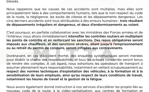 Nous déplorons profondément cette situation et, au nom du Président de la République et du gouvernement, adressons nos condoléances les plus sincères aux familles des victimes. Nous souhaitons également un prompt rétablissement aux blessés. Nous rappelons que les causes de ces accidents sont...