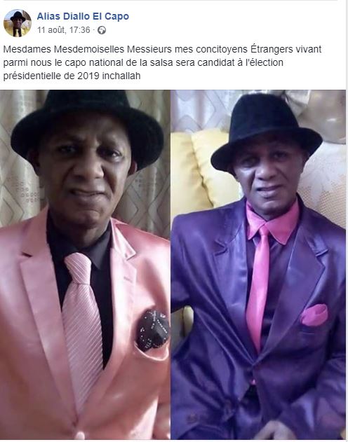 « Mesdames Mesdemoiselles Messieurs mes concitoyens Étrangers vivant parmi nous le capo national de la salsa sera candidat à l’élection présidentielle de 2019 inchallah, » a posté l’artiste sur Facebook, » peut -on lire sur sa page Facebook.