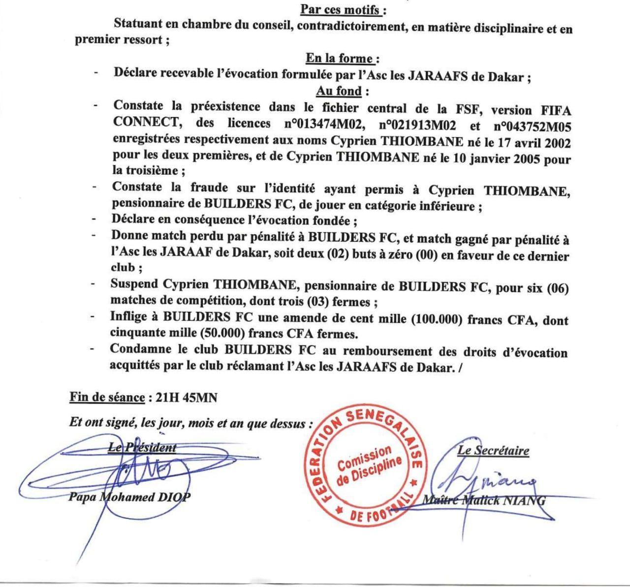 La Commission de discipline de la Fédération sénégalaise de football (Fsf) a rendu ce mardi une décision lourde de conséquences pour le club Builders FC, reconnu coupable d’avoir aligné un joueur sous une fausse identité lors d’un match officiel. Le dossier, soulevé par l’ASC les Jaraaf de Dakar, a été jugé recevable et fondé par les instances fédérales. Au cœur de l’affaire : le joueur Cyprien Thiombane. Selon les constats établis par la Fsf dans le document, trois licences différentes ont été enregistrées à son nom, dont deux sous une date de naissance correspondant à l’année 2002, et une autre à 2005. Cette dernière aurait permis à Thiombane, joueur de Builders FC, de participer à des compétitions en catégorie inférieure, ce qui constitue une fraude manifeste sur l’identité. Face à ces éléments, la Commission a pris plusieurs décisions disciplinaires : Le match en question est attribué par pénalité à l’ASC les Jaraaf de Dakar, sur le score de 2-0 ; Le joueur Cyprien Thiombane est suspendu pour six matchs, dont trois fermes ; Builders FC écope d’une amende de 100.000 francs Cfa, dont 50.000 ferme ; Le club est également contraint de rembourser les frais d’évocation engagés par le Jaraaf. Le club de la Médina affrontera Génération Foot, qui avait éliminé une vaillante équipe de Guelwaars (1-0).