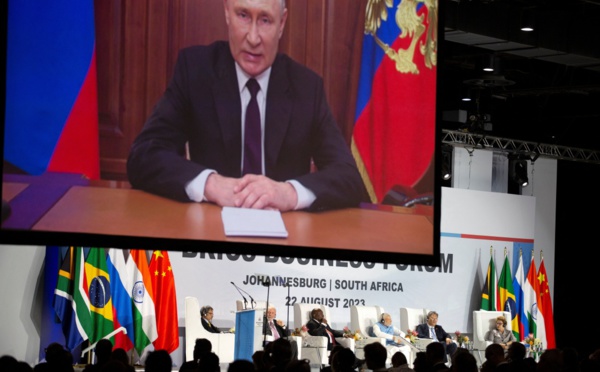 Un message enregistré du président russe Vladimir Poutine est diffusé lors du discours d'ouverture du sommet des BRICS à Johannesburg, en Afrique du Sud, le 22 août 2023. Les dirigeants des principaux pays du groupe des Brics se sont engagés à renforcer les liens entre les économies mondiales...