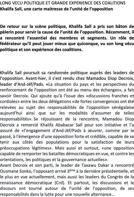 C’est dire que l’ancien responsable du Ps et ex-maire de Dakar, en politicien averti, est en train de signer un retour effectif et marquant sur la scène politique, après une longue hibernation, suite à son emprisonnement. Et par sa démarche actuelle, il démontre sa maturité et son expérience politique. Qui mieux que Khalifa Sall peut mesurer à sa juste valeur l’importance d’une coalition forte pour pouvoir espérer gagner des collectivités locales, notamment Dakar et les capitales régionales ? Lui qui avait mis en place Taxawu Dakar, une coalition de plusieurs partis (partis et leaders de gauche, de libéraux, de socialistes…) et d’indépendants, qui a tenu tête à la mouvance présidentielle dans la capitale. Qui mieux que lui est conscient de la valeur d’une coalition forte de l’opposition, lui qui, au Ps, à côté d’Abdoulaye Bathily, Amath Dansokho, Landing Savané, Tanor, Niasse, a été acteur de premier plan de plusieurs coalitions de l’opposition, qui ont conduit à la seconde alternance ? Incontestablement, il est une carte maitresse dans cette quête d’unité de l’opposition, où beaucoup de leaders, sont des néo-politiciens et n’ont pas son vécu et son savoir-faire politique. Et ce n’est pas étonnant qu’il soit conscient de ce rôle de fédérateur qu’il peut jouer plus que tout autre leader, dans cette opposition. Une opposition aujourd’hui, affaiblie et plongée dans la méfiance et la suspicion, après le départ brutal d’Idrissa Seck qui était pressenti pour être son chef, et d’autres annoncés sur le départ pour la mouvance présidentielle. Une opposition qui a besoin plus que jamais de mutualiser ses forces pour s’en sortir lors des prochaines échéances électorales, face au régime qui s’est beaucoup renforcé.