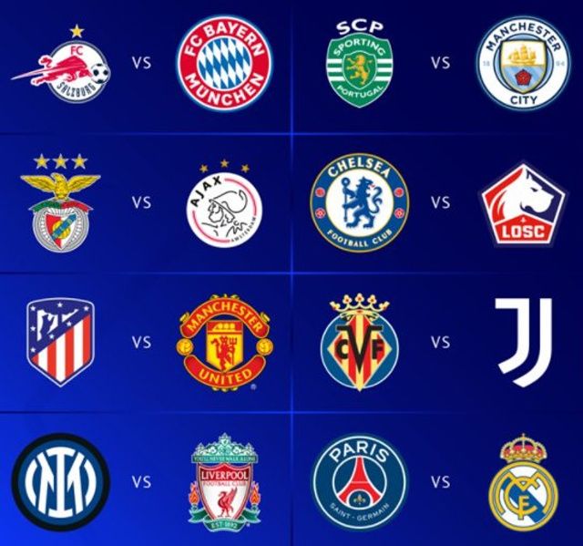 Le programme des 8es de finale : Match 1 : Salzbourg-Bayern Match 2 : Sporting-Manchester City Match 3 : Benfica-Ajax Match 4 : Chelsea-LILLE Match 5 : Atletico-Manchester United Match 6 : Villarreal-Juventus Match 7 : Inter-Liverpool Match 8 : PARIS SG-Real Madrid - Source: Maxifoot, https://www.maxifoot.fr/football/article-49291.htm#footref