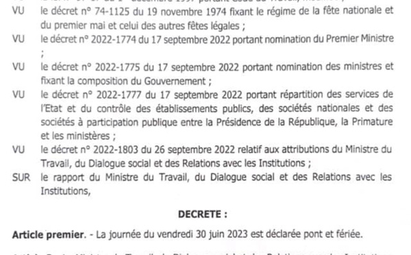 Le président de la République, Macky Sall, a déclaré le vendredi 30 juin, lendemain de la Tabaski, jour férié et chômé.   "Cette journée revêt un caractère sacré et est une occasion de solidarité, de prières et de rassemblement familial, conformément à nos traditions religieuses et sociétales....